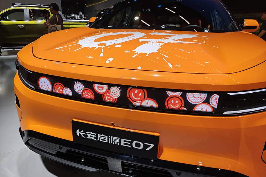 新款启源E07在外观设计上追求简洁而不失力量感,前脸设计尤为引人注目。大灯组与显示屏巧妙融合,能够展示多变的互动图案与灯光特效,增添了不少科技感。灯组下方的雷达模组与熏黑下包围,以及导流槽的设计,共同营造出既运动又越野的视觉体验。