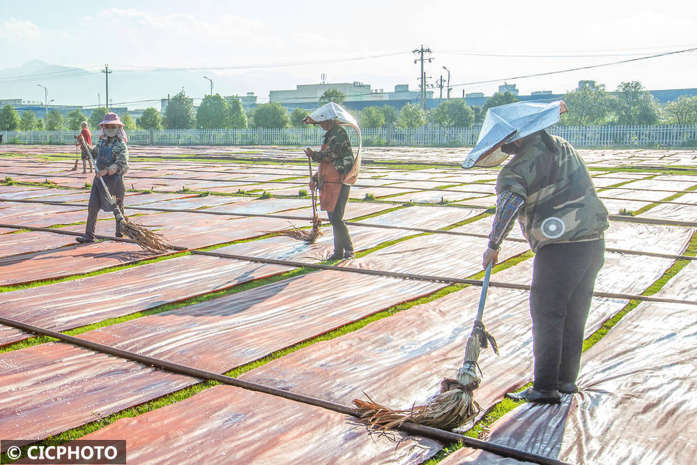 三伏天,广西梧州市蒙山县持续高温,一家丝绸企业实行错时上岗,让工人充分利用上午、下午气温相对较低时增加作业时间,晾晒香云纱,减少中午高温作业时间。同时,工人都做好防晒和防暑措施,在保证人身安全的前提下开展工作。